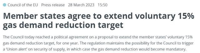 為應對能源危機,歐盟成員國當?shù)貢r間3月28日達成協(xié)議,同意將“自愿減少15%天然氣消費的計劃”延長一年。