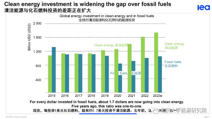 近日,國際能源署《2023世界能源投資》報告在北京發(fā)布。國際能源署首席能源經(jīng)濟學家Tim Gould介紹,五年前,清潔能源與化石能源的投資比為1:1,如今這一比例已擴大至1.7:1。同時,太陽能領(lǐng)域的投資將會在2023年首次超過石油生產(chǎn)投資。
