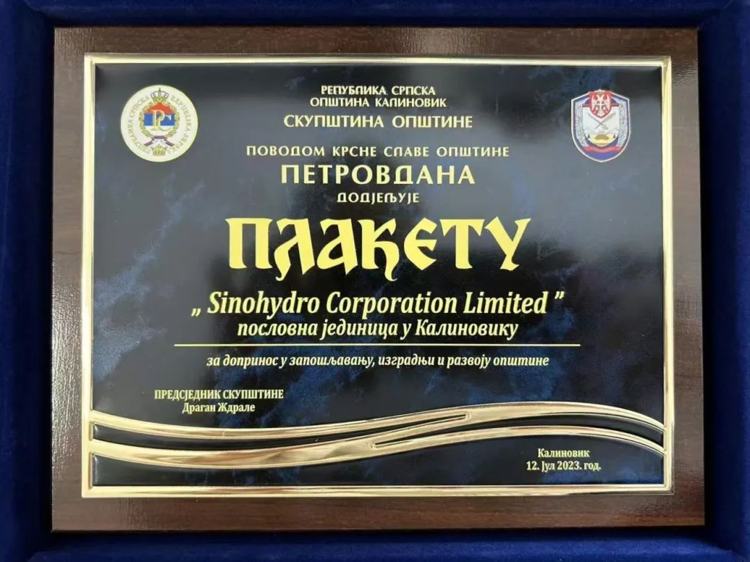 項(xiàng)目的建設(shè)受到當(dāng)?shù)卣母叨戎匾暎?023年,波黑優(yōu)樂(lè)高水電站項(xiàng)目部獲波黑卡利諾維克市“杰出貢獻(xiàn)獎(jiǎng)”,這是當(dāng)?shù)卣谟桉v在企業(yè)的最高榮譽(yù),表彰他們履行企業(yè)社會(huì)責(zé)任,為帶動(dòng)當(dāng)?shù)亟?jīng)濟(jì)作出的貢獻(xiàn)。
