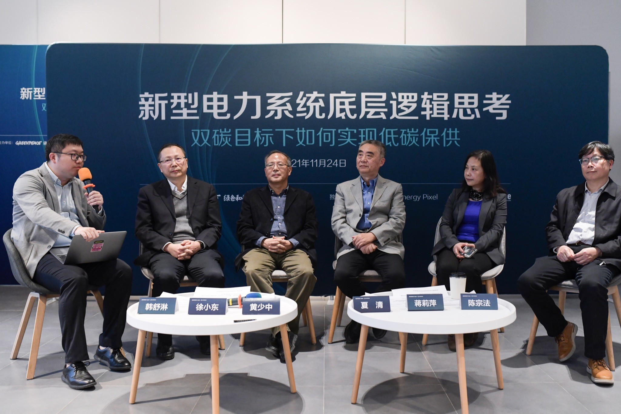 從左至右依次為:《財(cái)經(jīng)雜志》記者韓舒淋、電力規(guī)劃設(shè)計(jì)總院高級(jí)顧問徐小東、中國(guó)能源研究會(huì)研究員黃少中、清華大學(xué)能源互聯(lián)網(wǎng)智庫(kù)研究中心主任夏清教授、國(guó)網(wǎng)能源研究院副院長(zhǎng)蔣莉萍、中國(guó)能源研究會(huì)理事陳宗法。