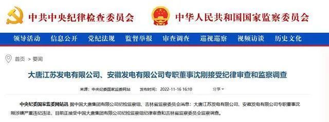 大唐江蘇發(fā)電、安徽發(fā)電專(zhuān)職董事涉嫌嚴(yán)重違紀(jì)違法被查