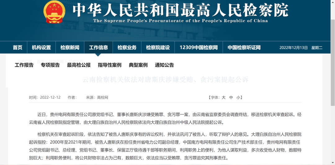 近日,貴州電網(wǎng)有限責(zé)任公司原黨組書(shū)記、董事長(zhǎng)唐斯慶涉嫌受賄罪、貪污罪一案,由云南省監(jiān)察委員會(huì)調(diào)查終結(jié),移送檢察機(jī)關(guān)審查起訴。經(jīng)云南省人民檢察院指定管轄,由大理白族自治州人民檢察院依法向大理白族自治州中級(jí)人民法院提起公訴。