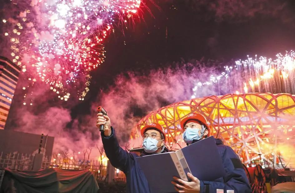 北京冬奧會閉幕式期間,國網(wǎng)北京電力冬奧保障人員在國家體育場附近巡檢供電設(shè)備。翟磊 攝
