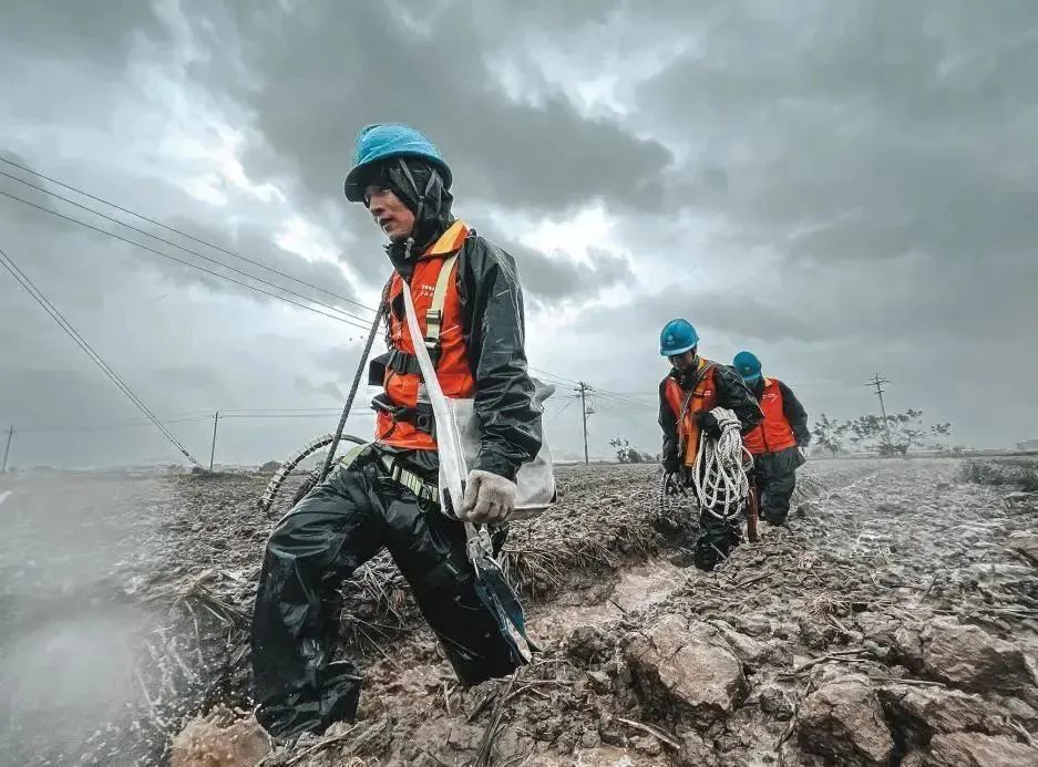 臺風(fēng)“梅花”在浙江舟山普陀沿海登陸后,國網(wǎng)浙江電力員工穿過泥濘的田地前往故障點開展搶修。程夢玨 攝
