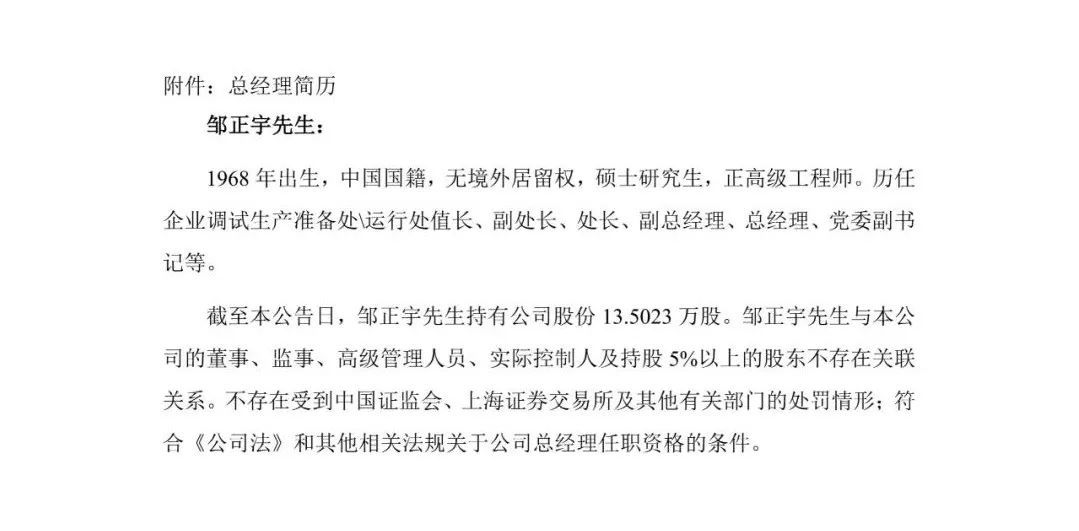 中國核電于4月25日召開第四屆董事會(huì)第十一次會(huì)議,審議通過了《關(guān)于聘任公司總經(jīng)理的議案》,決定聘任鄒正宇先生擔(dān)任公司總經(jīng)理職務(wù),任期自董事會(huì)審議通過之日起至本屆董事會(huì)任期屆滿日止。