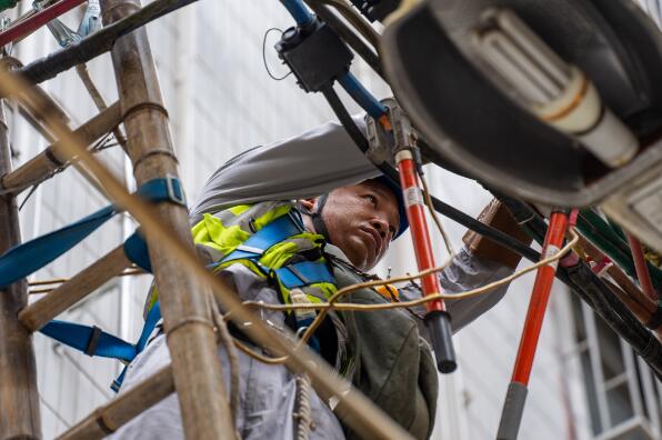 南方電網(wǎng)深圳龍崗供電局工作人員為城中村更換線路,迎接即將到來的夏季負荷高峰。