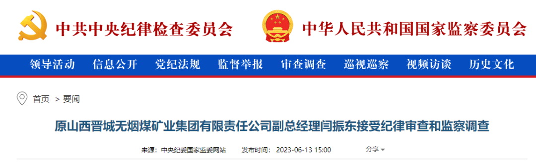 中央紀委國家監(jiān)委網站6月13日消息,據(jù)山西省紀委監(jiān)委消息:原山西晉城無煙煤礦業(yè)集團有限責任公司副總經理閆振東涉嫌嚴重違紀違法,目前正接受山西省紀委監(jiān)委紀律審查和監(jiān)察調查。
