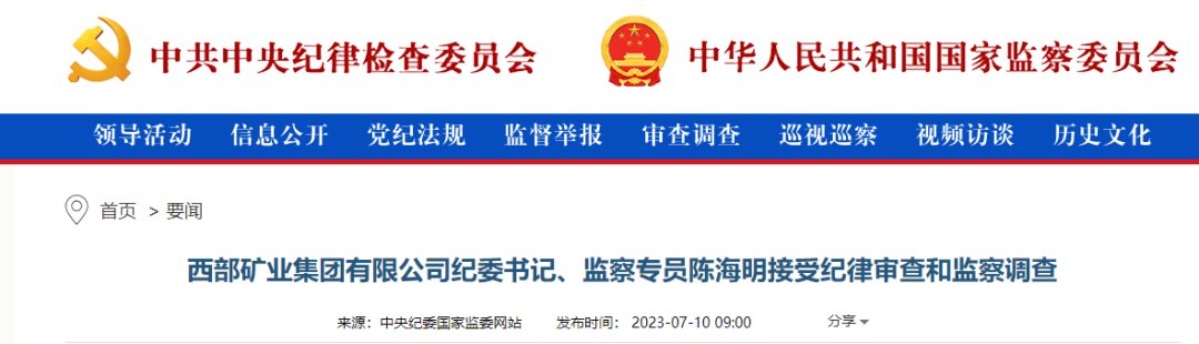 中央紀(jì)委國家監(jiān)委網(wǎng)站7月10日消息,據(jù)青海省紀(jì)委監(jiān)委消息:西部礦業(yè)集團有限公司黨委委員、紀(jì)委書記、監(jiān)察專員,青海省紀(jì)委委員陳海明涉嫌嚴(yán)重違紀(jì)違法,目前正接受青海省紀(jì)委監(jiān)委紀(jì)律審查和監(jiān)察調(diào)查。