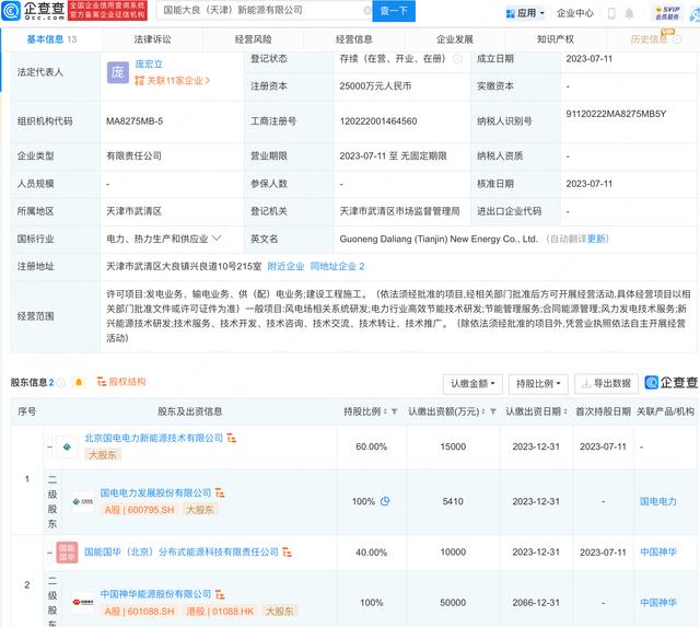 企查查APP顯示,近日,國能大良(天津)新能源有限公司成立,法定代表人為龐宏立,注冊資本2.5億元人民幣,經(jīng)營范圍包含:風電場相關(guān)系統(tǒng)研發(fā);電力行業(yè)高效節(jié)能技術(shù)研發(fā);節(jié)能管理服務(wù);合同能源管理等。企查查股權(quán)穿透顯示,該公司由國電電力(600795)、中國神華(601088)間接共同持股。