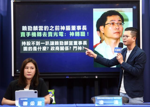 國民黨政策基金會副執(zhí)行長、桃園市議員凌濤在記者會上爆出云豹集團(tuán)捐贈政治獻(xiàn)金給民進(jìn)黨及“新潮流”政治人物。圖片來源:臺灣“中時新聞網(wǎng)”