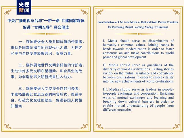 儀式上,發(fā)布了《中央廣播電視總臺(tái)與“一帶一路”共建國(guó)家媒體促進(jìn)“文明互鑒”聯(lián)合倡議》,呼吁媒體要做全人類共同價(jià)值的傳播者、世界文明多樣性的守護(hù)者、人文交流合作的引領(lǐng)者。