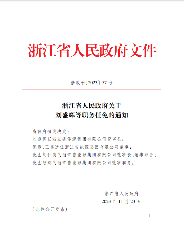 近日,據(jù)浙江省政府文件顯示,經(jīng)研究決定,劉盛輝任浙江省能源集團有限公司董事長;倪震、王其達任浙江省能源集團有限公司董事;免去胡仲明的浙江省能源集團有限公司董事長、董事職務;免去陸翔的浙江省能源集團有限公司董事職務。