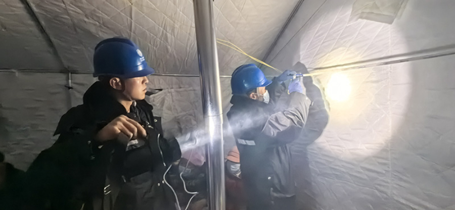 國(guó)網(wǎng)甘肅臨夏供電公司員工為積石山縣大河家鎮(zhèn)震區(qū)救治點(diǎn)帳篷接電。