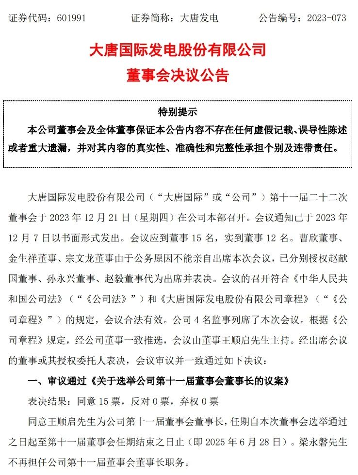 12月21日,大唐國際發(fā)布公告,大唐國際發(fā)電股份有限公司第十一屆二十二次董事會于12月21日召開,審議通過《關于選舉公司第十一屆董事會董事長的議案》,同意王順啟為公司第十一屆董事會董事長。梁永磐不再擔任公司第十一屆董事會董事長職務。