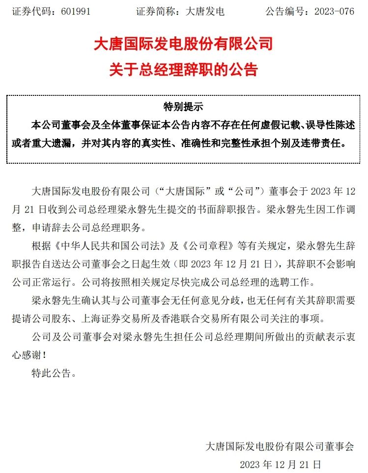 同日,大唐國際發(fā)布總經理辭職公告,公司董事會收到總經理梁永磐先生提交的書面辭職報告。梁永磐先生因工作調整,申請辭去公司總經理職務。