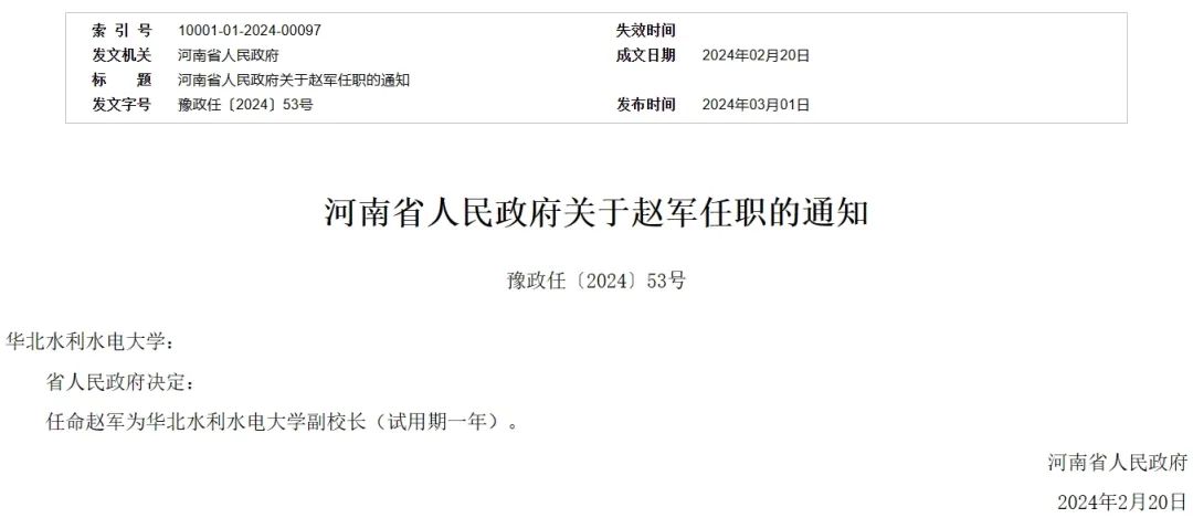 據(jù)河南人民政府網(wǎng)站3月1日消息,河南省人民政府決定:任命趙軍為華北水利水電大學(xué)副校長(zhǎng)(試用期一年)。