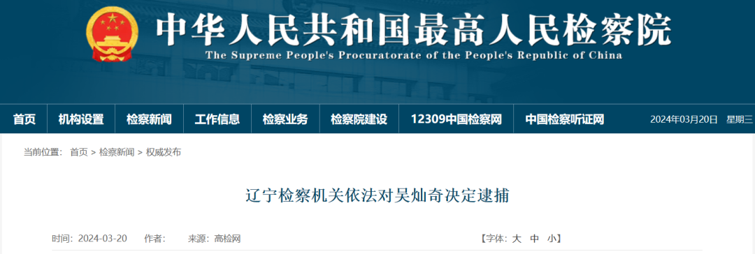經(jīng)遼寧省人民檢察院指定管轄,由朝陽市人民檢察院審查起訴。日前,朝陽市人民檢察院依法以涉嫌受賄罪對(duì)吳燦奇作出逮捕決定。該案正在進(jìn)一步辦理中。
