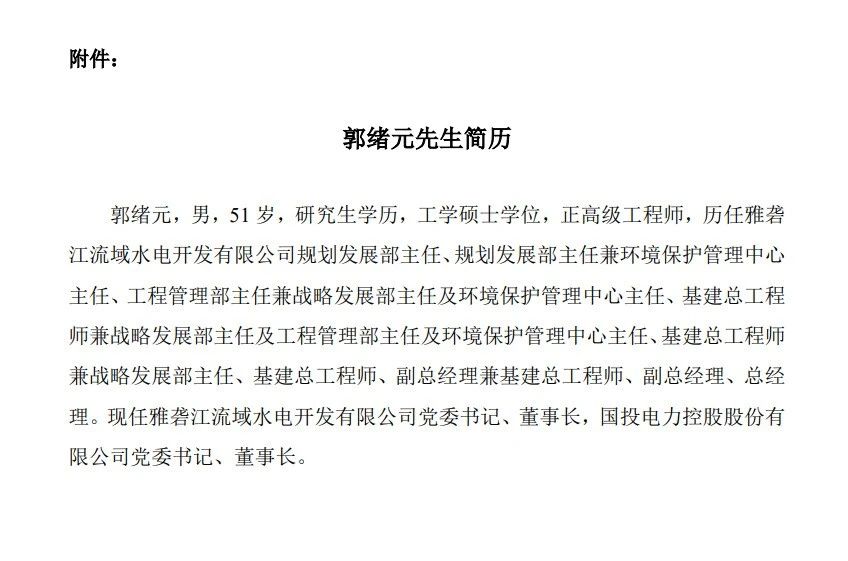 郭緒元任國投電力控股股份有限公司(以下簡稱“國投電力”)董事長。