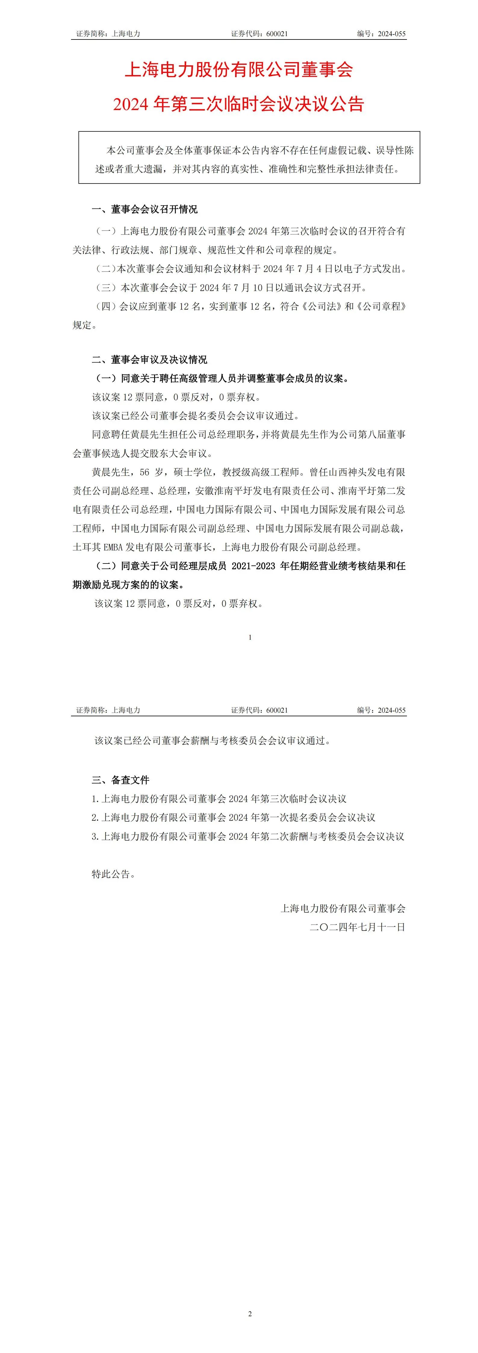 上海電力公告,同意聘任黃晨擔(dān)任公司總經(jīng)理職務(wù)。