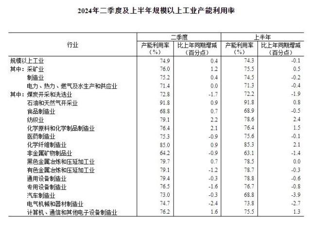 據(jù)國家統(tǒng)計(jì)局網(wǎng)站消息,2024年二季度,全國規(guī)模以上工業(yè)產(chǎn)能利用率為74.9%,比上年同期上升0.4個(gè)百分點(diǎn),比一季度上升1.3個(gè)百分點(diǎn)。
