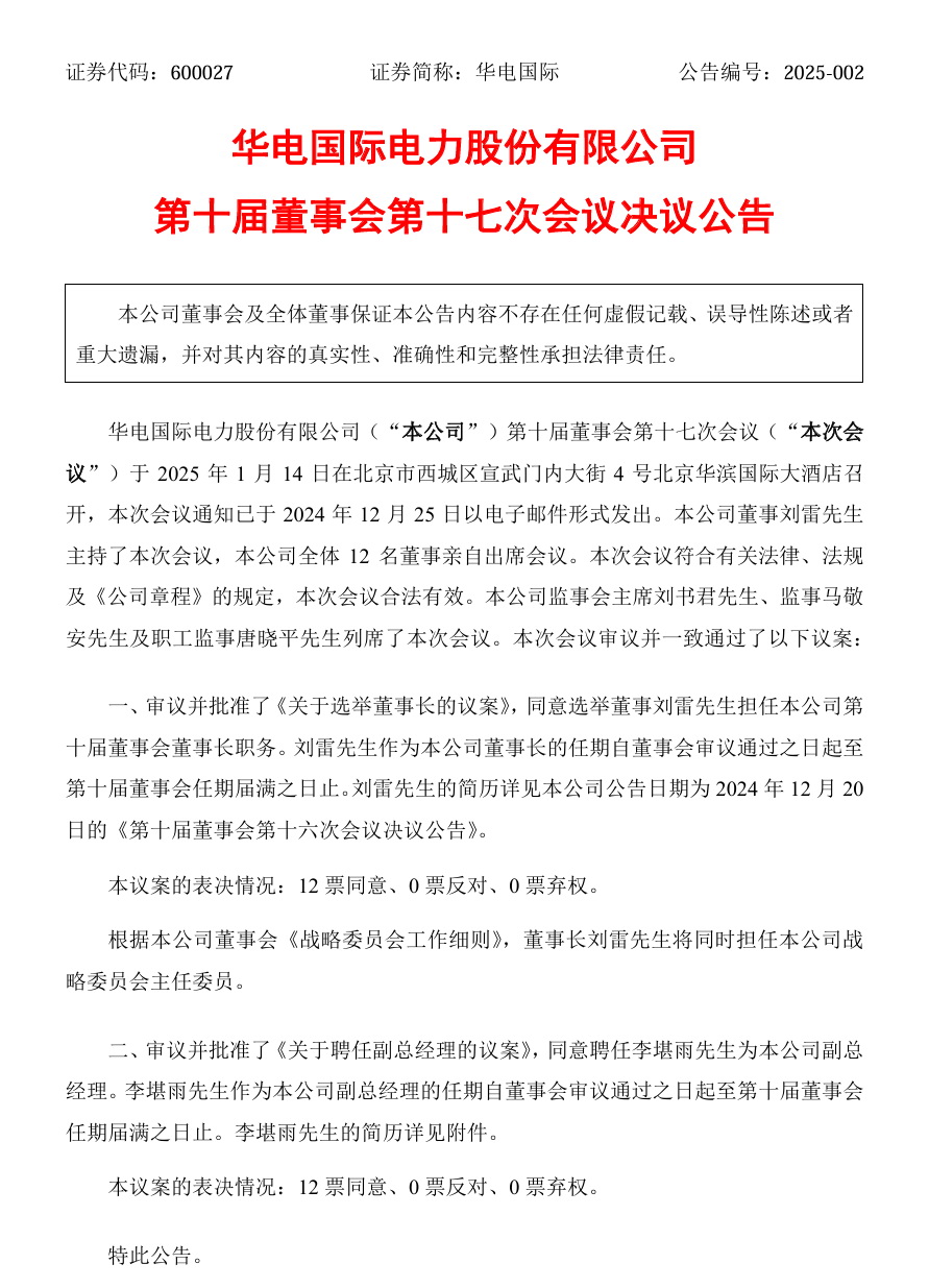 華電國(guó)際發(fā)布公告稱,公司第十屆董事會(huì)第十七次會(huì)議于1月14日召開(kāi)。會(huì)議審議并批準(zhǔn)了《關(guān)于選舉董事長(zhǎng)的議案》,同意選舉董事劉雷先生擔(dān)任本公司第十屆董事會(huì)董事長(zhǎng)職務(wù)。劉雷先生作為本公司董事長(zhǎng)的任期自董事會(huì)審議通過(guò)之日起至第十屆董事會(huì)任期屆滿之日止。