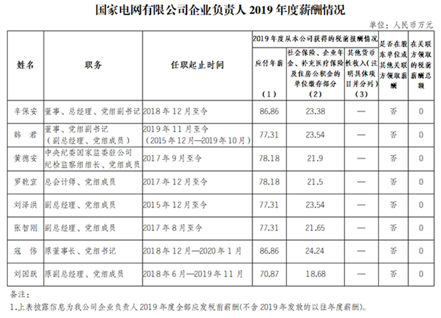 其中,以國家電網總經理、黨組副書記辛保安86.86萬元年薪為最高,時任國家電網董事長、黨組書記寇偉年薪同樣是86.86萬元。其次為華能集團黨組書記、董事長舒印彪年薪82.12萬元。