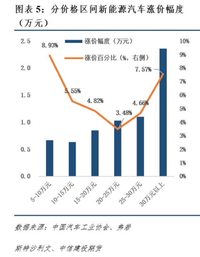 筆者研究發(fā)現(xiàn),不同價格區(qū)間的新能源汽車漲幅是不同。根據(jù)中信建投今年5月的數(shù)據(jù)來看,售價為10-30萬元的新能源汽車漲幅較小,而5-10萬元的新能源汽車漲幅最大。