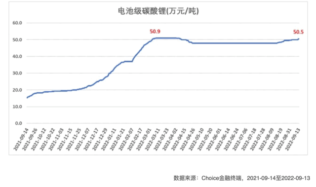 此外,此輪新能源汽車的價格上漲還和新能源汽車上游原材料價格的上漲有關。目前,中國市場電池級碳酸鋰價格已從2021年初的6萬元/噸上漲到近期的50萬元/噸。