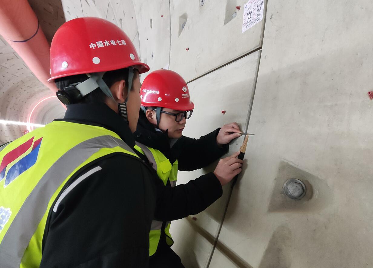 “安裝到隧道內(nèi)的一環(huán)環(huán)管片要嚴實平滑,確保沒有滴漏,錯臺要越小越好。”老鄧手持一把精巧的游標塞尺,當被安裝到隧道內(nèi)壁的管片形成新的一圈閉合,他就會用左手將一把筆直的鋼直尺放到新的兩環(huán)管片之間,然后將游標塞尺從下面往里塞,以此測量平整度。