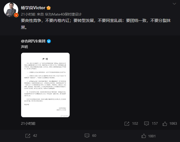 浙江吉利控股集團(tuán)高級(jí)副總裁楊學(xué)良隨后轉(zhuǎn)發(fā)了該聲明,并表達(dá)了個(gè)人觀點(diǎn),表示:要良性競(jìng)爭(zhēng),不要內(nèi)卷內(nèi)訌;要轉(zhuǎn)型發(fā)展,不要同室亂戰(zhàn);要團(tuán)結(jié)一致,不要分裂抹黑。