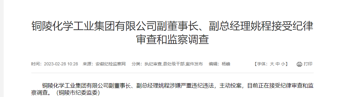2月28日,安徽紀(jì)檢監(jiān)察網(wǎng)發(fā)布消息,銅陵化學(xué)工業(yè)集團有限公司(簡稱“銅化集團”)副董事長、副總經(jīng)理姚程涉嫌嚴(yán)重違紀(jì)違法,主動投案,目前正在接受紀(jì)律審查和監(jiān)察調(diào)查。
