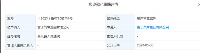 日前,公開信息顯示,雷丁汽車集團(tuán)有限公司新增一則破產(chǎn)審查案件,案號為(2023)魯0725破申1號,申請人和被申請人均為雷丁汽車集團(tuán)有限公司,經(jīng)辦法院為山東省濰坊市昌樂縣人民法院。
