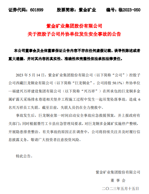 5月15日,紫金礦業(yè)發(fā)布公告,外協(xié)單位在施工過程中發(fā)生一起吊籠墜落事故,造成6名員工失聯(lián)。截至目前,失聯(lián)人員仍在全力搜救中。