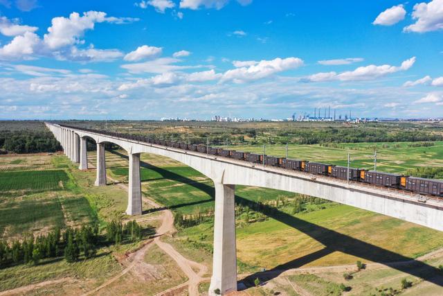 這是在準格爾旗境內(nèi)拍攝的運煤專列(7月8日攝,無人機照片)。