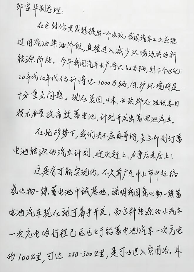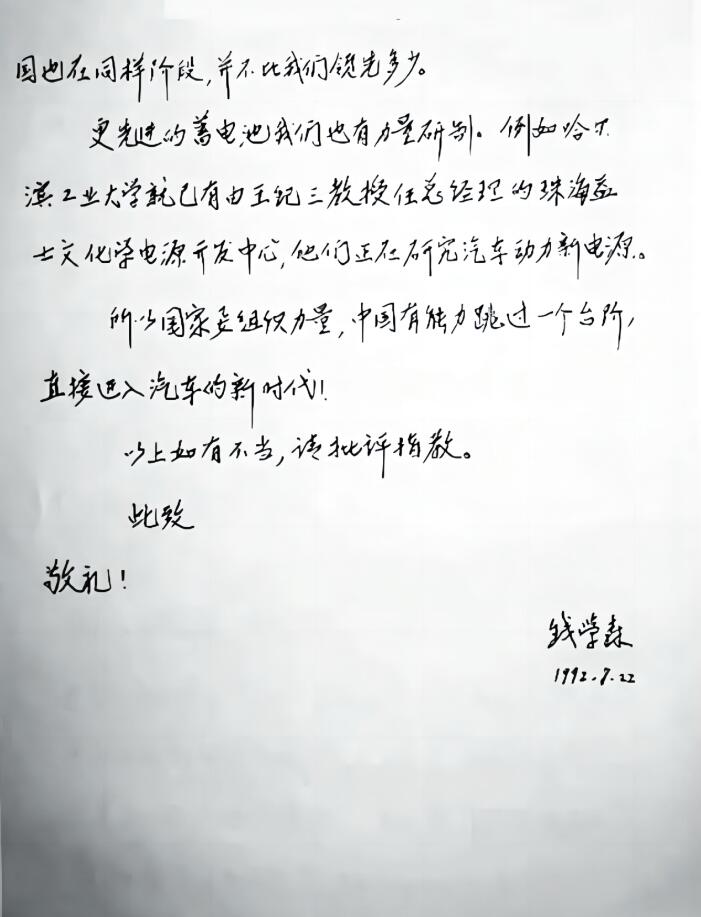 1992年,當時已81歲高齡的錢學森寫信給時任副總理鄒家華,提出了一個高瞻遠矚的建議:“我國汽車工業(yè)應跳過用汽油柴油階段,直接進入減少環(huán)境污染的新能源階段……到下個世紀20年代保護環(huán)境將是十分重要問題?,F(xiàn)在美國、日本、西歐都在組織各自技術力量攻高效蓄電池,計劃開發(fā)出蓄電池汽車。”