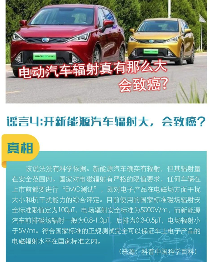 近日,中國互聯(lián)網(wǎng)聯(lián)合辟謠平臺(tái)發(fā)布《2023年新能源汽車行業(yè)辟謠榜》,其中針對(duì)網(wǎng)上流傳的“開新能源汽車輻射大、會(huì)致癌”說法進(jìn)行了權(quán)威辟謠。