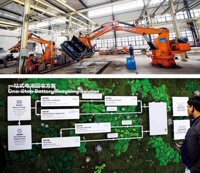 下圖:2023年4月,在上海車展期間,寧德時(shí)代展示的一站式電池回收方案。圖/視覺中國(guó)