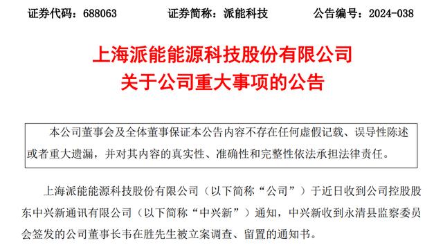 派能科技19日晚間披露的公告顯示,公司近日收到控股股東中興新通知,中興新收到永清縣監(jiān)察委員會(huì)簽發(fā)的公司董事長(zhǎng)韋在勝被立案調(diào)查、留置的通知書(shū)。