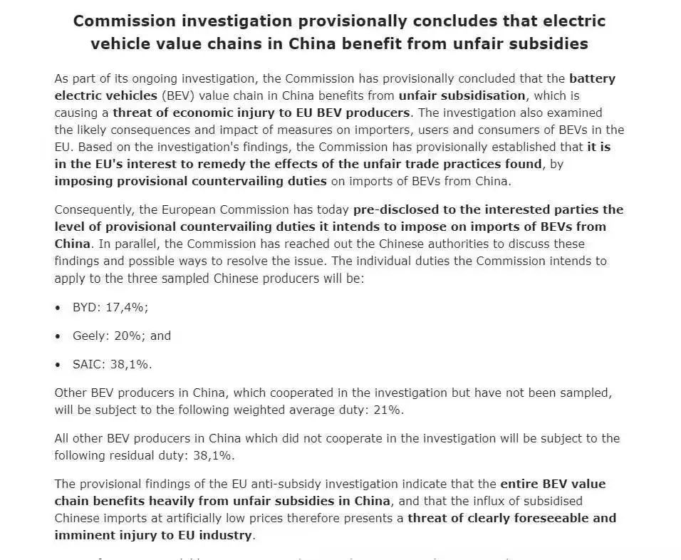 歐盟委員會公告發(fā)布后,商務(wù)部新聞發(fā)言人也表態(tài)稱,歐委會罔顧中國電動汽車優(yōu)勢來自開放競爭的客觀事實,罔顧世貿(mào)組織規(guī)則,罔顧中國相關(guān)企業(yè)對有關(guān)調(diào)查的全面配合,人為構(gòu)造并夸大所謂的“補貼”項目,濫用“可獲得事實”規(guī)則,裁出畸高的補貼幅度,是赤裸裸的保護主義行為,是制造并升級貿(mào)易摩擦,是以“維護公平競爭”為名行“破壞公平競爭”之實,是最大的“不公平”。中方將密切關(guān)注歐方后續(xù)進展,并將堅決采取一切必要措施,堅定捍衛(wèi)中國企業(yè)的合法權(quán)益。