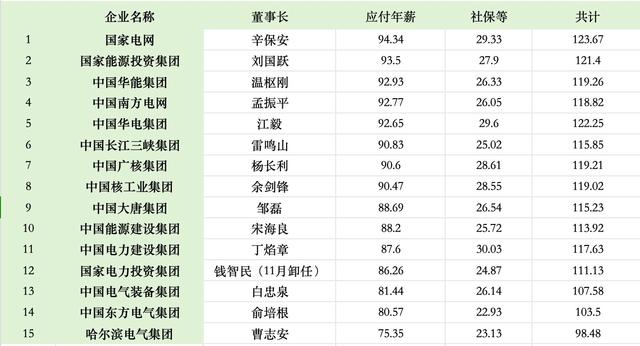 國(guó)資委近日公布了中央企業(yè)負(fù)責(zé)人2023年薪酬信息,其中包括22家能源、化工、電力央企,電力企業(yè)占15家,分別為“兩網(wǎng)兩建”(國(guó)家電網(wǎng)、南方電網(wǎng)、中國(guó)電力建設(shè)集團(tuán)、中國(guó)能源建設(shè)集團(tuán))、“五大發(fā)電”(中國(guó)大唐集團(tuán)、中國(guó)華能集團(tuán)、中國(guó)華電集團(tuán)、國(guó)家電力投資集團(tuán)、國(guó)家能源投資集團(tuán))、“三大電氣”(中國(guó)電氣裝備集團(tuán)、中國(guó)東方電氣集團(tuán)、哈爾濱電氣集團(tuán))、“兩大核電”(中國(guó)核工業(yè)集團(tuán)、中國(guó)廣核集團(tuán))以及中國(guó)長(zhǎng)江三峽集團(tuán)。