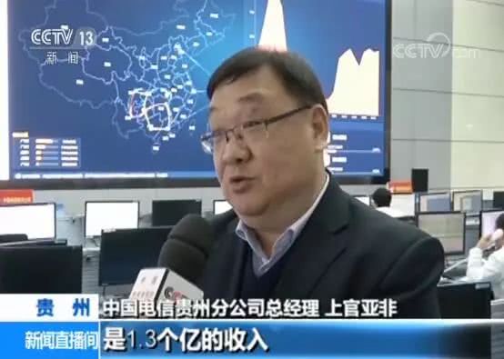 “中國電信貴州分公司總經(jīng)理 上官亞非:我們在2016年的時候是1500萬的收入,在2017年的時候是5300萬的收入,2018年本來定的計劃是八千萬的收入,結(jié)果現(xiàn)在我們統(tǒng)計出來是1.3個億的收入。增長超過百分之百?!?/p>