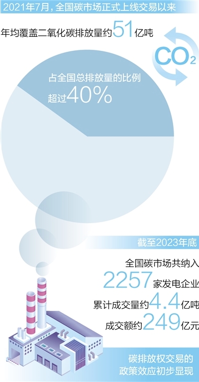 2021年7月全國碳市場(chǎng)正式上線交易以來,運(yùn)行整體平穩(wěn),年均覆蓋二氧化碳排放量約51億噸,占全國總排放量的比例超過40%。截至2023年底,全國碳市場(chǎng)共納入2257家發(fā)電企業(yè),累計(jì)成交量約4.4億噸,成交額約249億元,碳排放權(quán)交易的政策效應(yīng)初步顯現(xiàn)。