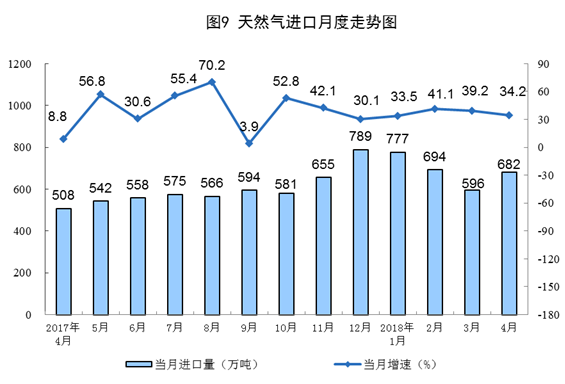 天然氣進口連續(xù)7個月保持30%以上的高速增長。4月份,天然氣進口682萬噸,同比增長34.2%,增速比上月回落5個百分點。1-4月份,進口天然氣2742萬噸,同比增長36.4%。