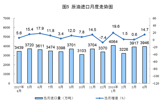 4月份,原油進口大幅增長,進口3946萬噸,同比增長14.7%,增速比上月加快14.1個百分點;日均進口131.5萬噸,再創(chuàng)歷史新高。1-4月份,進口原油1.5億噸,同比增長8.9%。