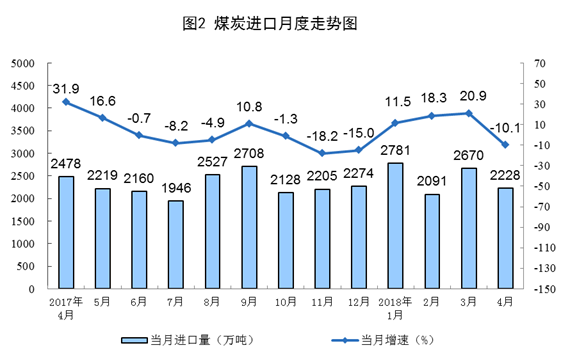 煤炭進口大幅下降。4月份,進口煤炭2228萬噸,同比下降10.1%。1-4月份,進口煤炭9768萬噸,同比增長9.3%。