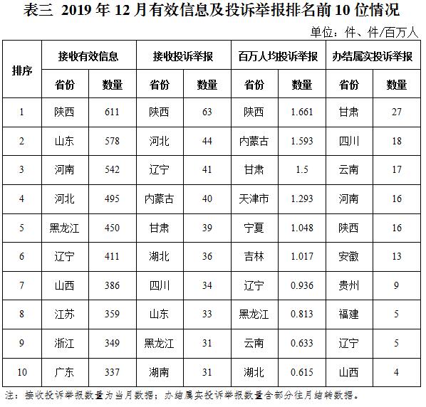 各?。ㄗ灾螀^(qū)、直轄市)按照收到的有效信息數(shù)量排序,陜西、山東、河南、河北、黑龍江等列全國(guó)前10位;按照投訴舉報(bào)數(shù)量排序,陜西、河北、遼寧、內(nèi)蒙古、甘肅等排在全國(guó)前10位;按照百萬(wàn)人均投訴舉報(bào)數(shù)量排序,陜西,內(nèi)蒙古,甘肅,天津市,寧夏等排在全國(guó)前10位;按照辦結(jié)屬實(shí)投訴舉報(bào)數(shù)量排序,甘肅、四川、云南、河南、陜西等排在全國(guó)前10位。(2019年12月有效信息及投訴舉報(bào)排名前10位情況見(jiàn)表三)