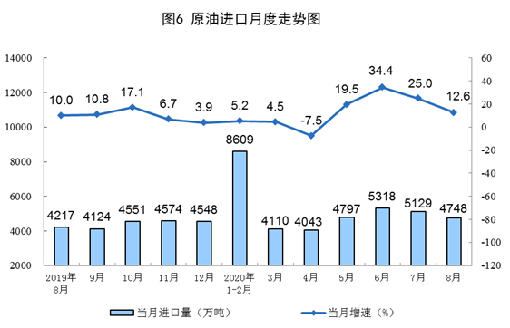 原油進(jìn)口增速回落,國(guó)際原油價(jià)格小幅上漲。8月份,進(jìn)口原油4748萬(wàn)噸,同比增長(zhǎng)12.6%,增速比上月回落12.4個(gè)百分點(diǎn)。1—8月份,進(jìn)口原油3.7億噸,同比增長(zhǎng)12.1%。8月28日布倫特原油現(xiàn)貨離岸價(jià)格為45.22美元/桶,比7月31日的43.13美元/桶上漲4.8%。