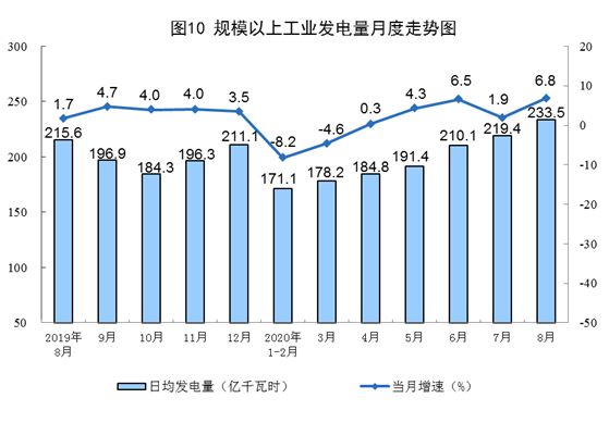 電力生產(chǎn)較快增長(zhǎng)。8月份,發(fā)電量7238億千瓦時(shí),同比增長(zhǎng)6.8%,增速比上月加快4.9個(gè)百分點(diǎn);日均發(fā)電量233.5億千瓦時(shí),環(huán)比增加14.1億千瓦時(shí)。1—8月份,發(fā)電量47728億千瓦時(shí),同比增長(zhǎng)0.3%。