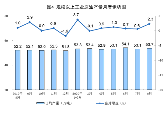 原油生產(chǎn)加快,加工有所放緩。8月份,生產(chǎn)原油1665萬(wàn)噸,同比增長(zhǎng)2.3%,增速比上月加快1.7個(gè)百分點(diǎn);加工原油5947萬(wàn)噸,增長(zhǎng)9.2%,比上月放緩3.2個(gè)百分點(diǎn)。1—8月份,生產(chǎn)原油13015萬(wàn)噸,同比增長(zhǎng)1.5%;加工原油4.4億噸,同比增長(zhǎng)3.2%。