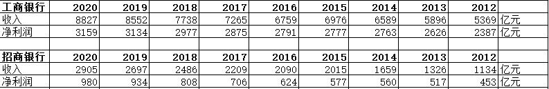 工商銀行、招商銀行2012-2020年?duì)I收、利潤(rùn)(單位:億元,人民幣)